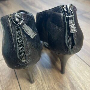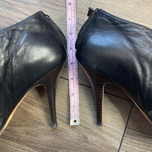 These elegant Cole Haan heels feature a sleek peep-toe design and sophisticated silhouette, ideal for a polished look. The black leather construction adds a timeless appeal, while the back zipper ensures an easy-to-wear experience. A versatile choice for professional settings or formal gatherings.
