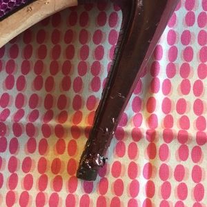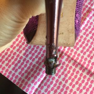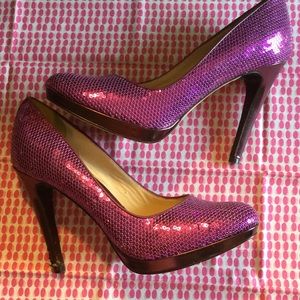 4.5 inch heel height. Platform .5 inches. Heel slips in both shoes. Damage to left shoe from puppy noshing. A few Sequins missing but not visible when worn. Heel can likely be repaired. See photos. Price reflects condition. Offers considered.