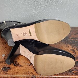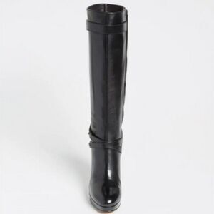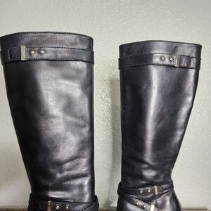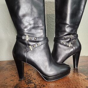 Elegant black leather boots. Features sleek design. High heel for added height. Nike air insoles. Perfect for any occasion.
