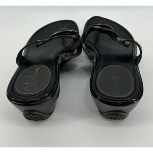 The Cole Haan NikeAir Slide Sandals in black are a stylish and comfortable slip-on option for women in size 7.5B. Made with patent leather, these sandals feature a slide style with adjustable comfort for a personalized fit. Perfect for everyday wear or casual outings, these sandals are a versatile and practical choice for any wardrobe.
