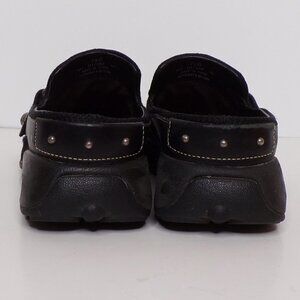 Cole Haan women's slip-on leather athletic mule, removable footbeds, very nice pre-owned condition. Soles are in good shape; small wear spots on inner cloth rand of each foot (see pics) are cosmetic only. Black leather with buckle strap, size 7.5B. Smoke free home.