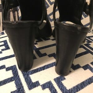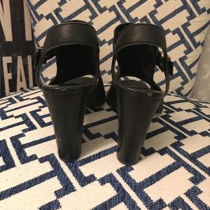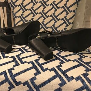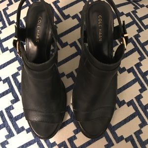 Cole Haan Leather Open Toe Sandals. 4 inch heel. Buckle closure- gold. Soles are in excellent condition. There are scuff marks on each of the heels as shown in picture. Offers welcome.