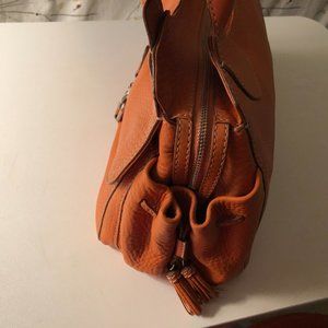 Beautiful pebble leather satchel with brushed silver hardware. Front pocket with hasp perfect for gloves! Interior slip pockets and zip pocket. Two gathered small side pockets complete this beautiful bag! In execllent shape.