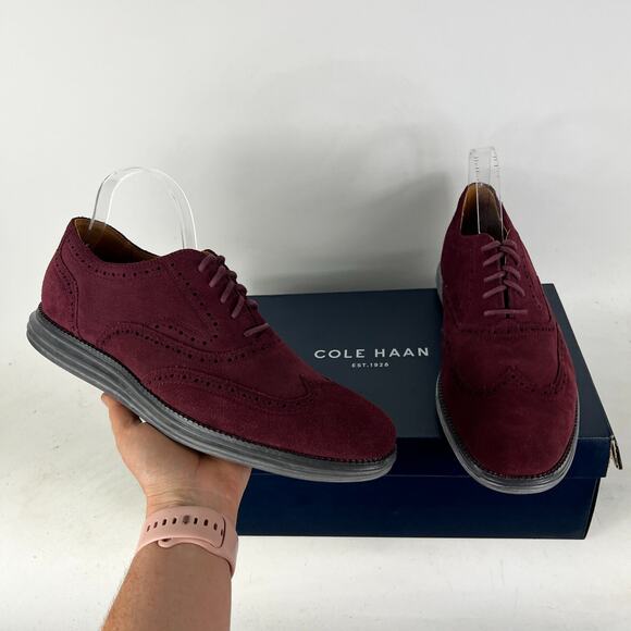 New with box. Elevate your formal look with these Cole Haan Original Grand Wingtip Oxfords in Port Royale. These dress shoes feature closed toe and lace-up closure, perfect for any formal occasion. The suede upper material and foam insole provide comfort and style, while the rubber outsole ensures durability. The wingtip design and royal theme add a touch of sophistication, making these shoes a great addition to any wardrobe. Available in men's size 11.5, these Cole Haan Grand Wingtip Oxfords are perfect for winter, summer, fall, and spring.