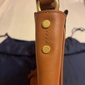 A very stylish yet practical leather tote from Cole Haan that goes with just about everything. Multiple pockets in lined interior and a zipper pouch in the front exterior. Sturdy shoulder strap with grommets at the sides. Cole Haan embossed logo on one side, very subtle. Only worn a few times and in great condition~ one of those bags that will just get better with age. Measurements: 12" in length from bottom of strap to bottom of the bag 13.5 across Expands to 3.5 inches and can expand to more if needed