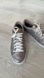 Stylish metallic gray sneakers. Features white laces. Comfortable and chic design.