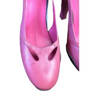 These Cole Haan heels feature a vibrant pink color with a medium-height heel and elegant cut-out details on the sides. The rounded toe and glossy finish add a touch of sophistication, making them perfect for special occasions.