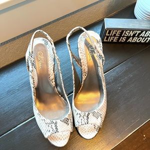 Super cute faux python slingbacks with peep toe and black stacked wedge heel. Cole Haan US size 9.5
