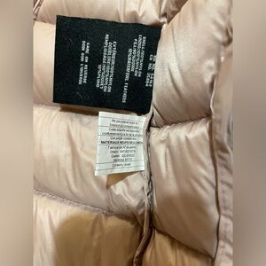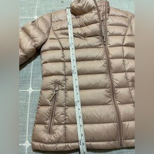 Features: Down Jacket, Funnel Neck, Puffy, Quilted Down, Zip Front, Three Deep Zip Pockets, Lightweight, Shimmery, Satin Lined, Very Warm, Silky, Comfortable