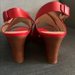 Elegant red leather with a wooden wedge. Features adjustable ankle straps for a perfect fit. New with tag. size 6