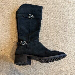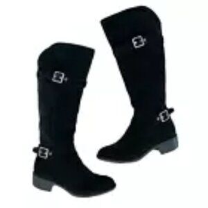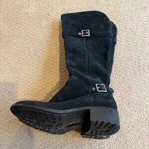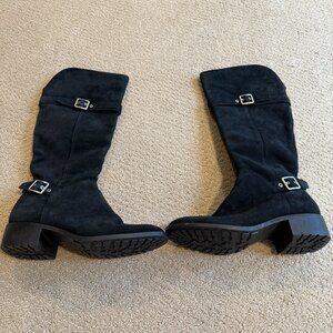 Cole Haan Indiana black waterproof suede knee high riding boots style D42391. Feature a black waterproof suede leather upper, interior zipper, two adjustable side buckles with silver hardware, rubber sole and stacked block heel. Shaft height approximately 14.5", heel 1.25".
