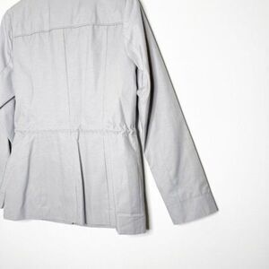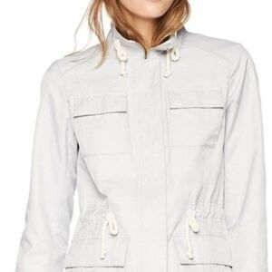Features a stand-up collar, zip and button front closure, multiple functional pockets, and a cinched waist for a customizable fit
