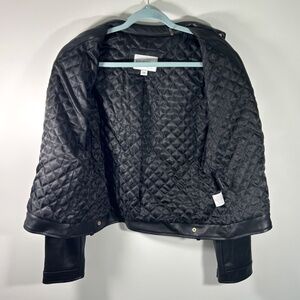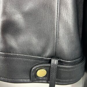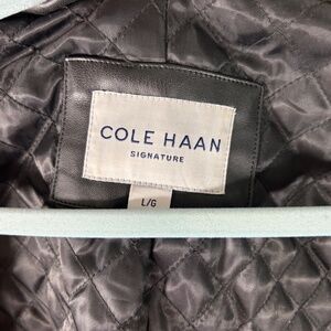 Great for the autumn chill and a great capsule jacket. Faux leather black cafe/moto jacket by Cole Haan. Quilted satin lining, goldtone hardware. This jacket is in pristine condition with no issues of any kind. Ready to rock for Fall. Size Large: