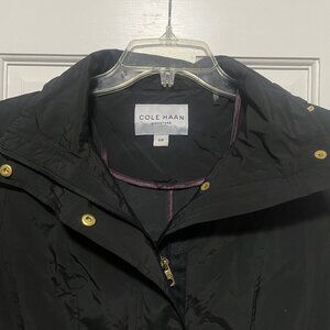 Black raincoat by Cole Haan Signature, Women's size Small (fits sizes 4-6). The longline design, gold accents, and princess seams give this raincoat a sleek, tailored look and can easily be dressed up or down for professional or casual wear. It can easily be layered for wear thoughout the seasons and has a zippered pocket that's great for holding a pair of gloves in the fall/winter or even a small umbrella. This raincoat has a zipper and snap closure, with two front pockets, and a detatchable hood that unzips from the coat collar. This is a packable raincoat, and comes with a small bag that it can be folded into for easy storage. It's a great closet staple, comes from a smoke and pet free home, and is in excellent pre-owned condition.