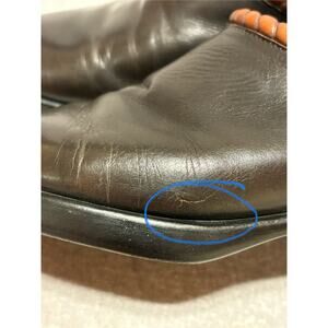 From smoke and pet free home. Barely noticeable wear on heels. A few creases in the leather.