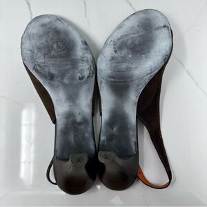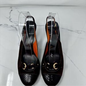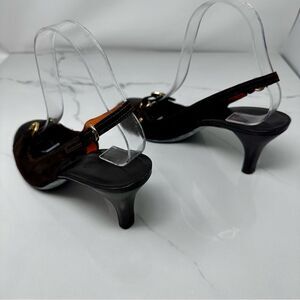 Cute brown slingback pumps from Cole Haan. They are an 8.5 EXTRA-NARROW. They have leather snakeskin embossed toes with suede straps and faux strap, with bright brass buckles and rivets. The straps are adjustable.