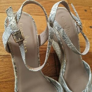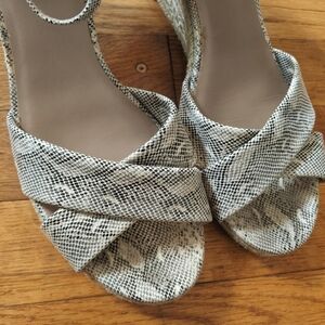 Black and beige, faux snake skin espadrille wedges with cross cross toe strap, adjustable ankle strap, and 3 inch wedge.