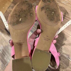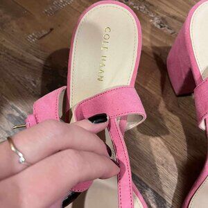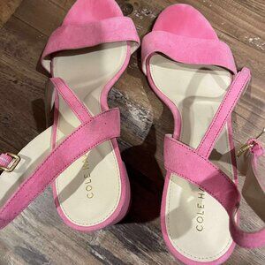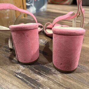 Pink suede low block heels. Has cute toe and ankle strap, has some signs of wear as shown in photos.