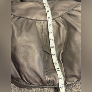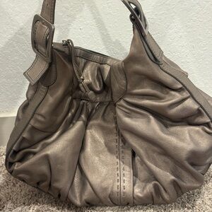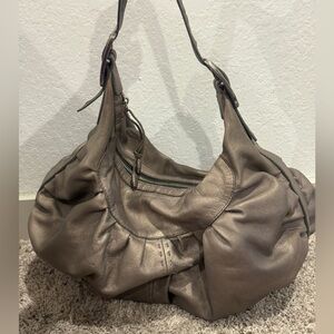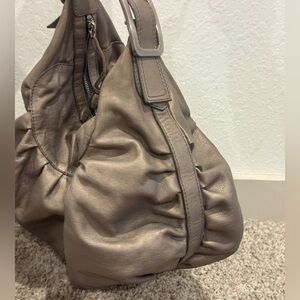 This Cole Haan hobo bag in tan showcases a slouchy design with gentle folds and a crescent-like shape, exuding a casual yet sophisticated charm. Made from a soft material, it features a subtle sheen that enhances its elegant appeal. The bag's minimalistic style is accentuated by its gathered pleats and curved handles, making it a versatile accessory for any occasion.