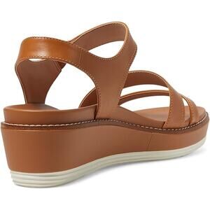 Stylish tan sandals with adjustable strap. Comfortable wedge sole. Perfect for casual wear. I wore these twice to an indoor event. They didn’t not fit my foot well but the rubber bottom is great for shock absorbing walking etc