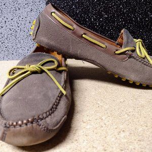 Cole Haan Men's Tan suede moccasins and leather trim/ lime accents and laces. Moccasins are a size 10.5D, pre-owned with some signs of rubbing on heels and under toe area. ( Bonus gift included)