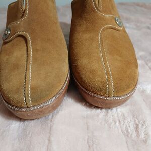 These Cole Haan mules showcase a warm tan suede finish, complemented by a medium-height wooden heel for a touch of elegance. The slip-on design with a rounded toe offers both style and comfort, making them a versatile choice for any occasion. Pre-owned in good used condition. Please refer to pictures for best description and condition verification.