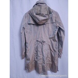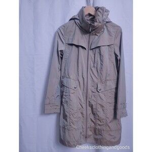This is a pre-owned Cole Haan Topaz Iridescent Trench Raincoat Jacket Stow-Away Hood Women's size MEDIUM. This is in excellent condition.