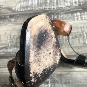 Black patent, T-strap, open toe heels with a wide, whiskey-brown ankle strap decorated with steel grommets. Vintage style with light wear on the sole but otherwise great condition!