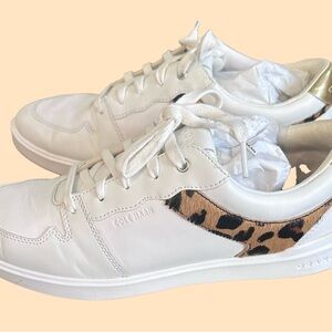 Stylish white sneakers with tan animal print accents. Comfortable and trendy design. Perfect for casual wear.