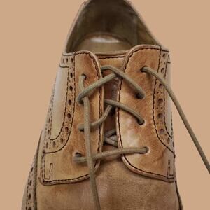 Original vintage look Cole Haan Wingtip Giraldo Derby Brogue Shoes. Crafted in a rich British Tan leather, these shoes exude timeless style and quality. The intricate wingtip design and brogue detailing add a touch of elegance, making them perfect for both formal and casual occasions.