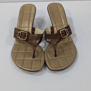 Cole Haan Woman Leather Brown Gold Wedge Thong Sandals Strappy Buckle Size 10B
