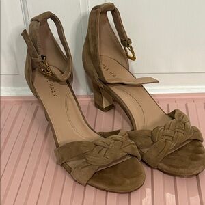 Chic brown suede heels with braided front. Adjustable ankle strap for secure fit. Ideal for stylish outings.