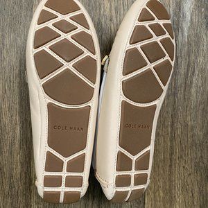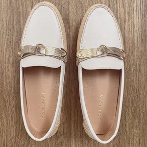 Cole Haan Women's Evelyn Driver. White/natural with gold bow. Size 7.5