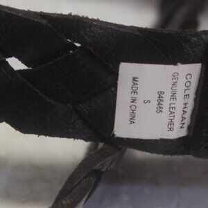 This women's small Cole Haan Leather belt is in good condition. The leather belt shows little wear. The gold colored belt buckle has some surface scratches. The belt measures about three quarters of an inch wide and about 43 inches total length including buckle. The way the belt is made it could be hook almost anywhere along the length of the belt. The color of the belt is black with a gold colored buckle. 208
