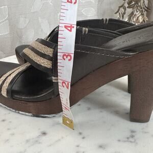 Gently worn with light wear on soles (see pics), leather upper, wooden heel, braided rope accents. Spot clean only. Made in Brazil.