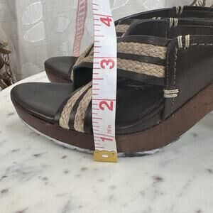 Gently worn with light wear on soles (see pics), leather upper, wooden heel, braided rope accents. Spot clean only. Made in Brazil.