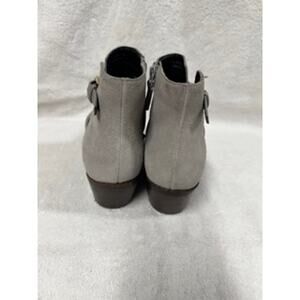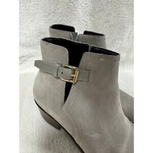 Step into fall with these chic Cole Haan Willette II Ankle Booties! These booties feature a beautiful gray suede and a stylish split side design. Perfect for adding a touch of elegance to any outfit. Designed for both style and comfort. The sleek gray suede upper and almond toe create a timeless look. The synthetic lining and buckle closure provide a secure and customizable fit. Ideal for professional settings and casual outings alike.