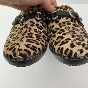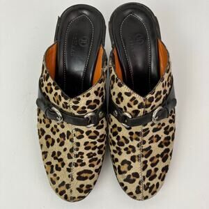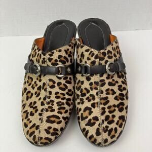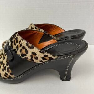 Cole Haan Y2K Leopard Print Leather & Calf Hair Heeled Mules Clogs Buckle Detail