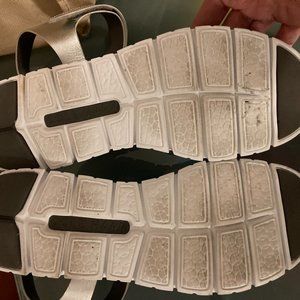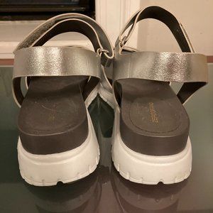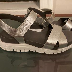 These awesome silver metallic Cole Haan sandals have only been worn twice; they're in amazing condition, and super comfortable! Velcro fastening, cushioned, fantastic looking. Size 10.