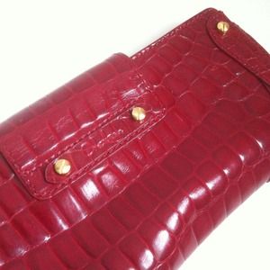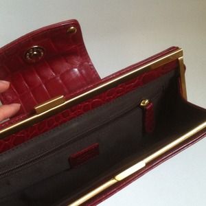 Alligator textured red clutch with gold hardware. Interior small zip pocket. Perfect for going out!