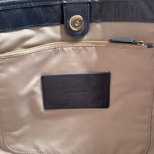 One large zipper pocket. Multiple pockets on opposite side. Tote bag closes with one magnetic button.