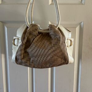 Cole Haan golden brown checkered fabric & beige leather tote gold tone a…