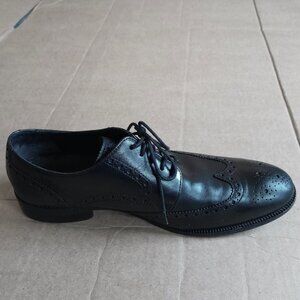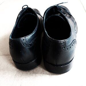 The Cole Haan Oxford black dress shoes #C24117 in size 10 medium offer a stylish and comfortable option for men looking for a classic shoe. With a round toe shape, lace-up closure, and leather upper and lining material, these shoes are designed for durability and a sleek look. The rubber outsole provides traction, making them suitable for all seasons. The Oxford style and solid black color add a touch of sophistication to any outfit, making them a versatile choice for formal occasions or everyday wear. Made by Cole Haan, known for quality and design, these shoes are a timeless addition to any man's wardrobe.