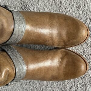 Pre-loved. Cole Haan knee-high boot in pull-on design featuring snake-embossed straps at opening and ankle with silver-tone buckles and low-stacked heel. Size 5