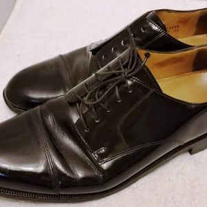 Very nice Cole Haan "ALL LEATHER" lace up wing tip. Size 11 D. Very good condition pre-owned shoes. High Gloss upper, leather lined and stitched leather sole. (please note that one shoe is missing the lace in the pictures but it does ship with both laces) There is what appears to be two small ink marks inside the left shoe. See Pics.