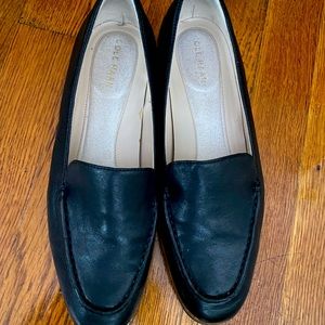 Pre-own Cole Haan black leather loafers with contrast stitching. Slightly worn. Original box included. Sz 6.5, 1-1.5 inches. See photos. No return.