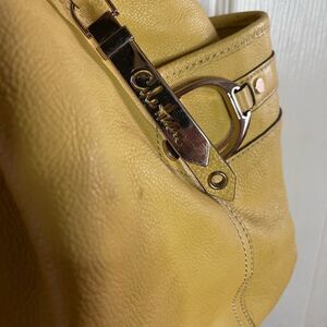 Cole Haan leather yellow mustard large shoulder bag braided straps and gold tone accents two side pockets top snap closure side zipper two side pockets middle zipper compartment pre owned in good used condition normal wear see all pictures any questions please message.F7