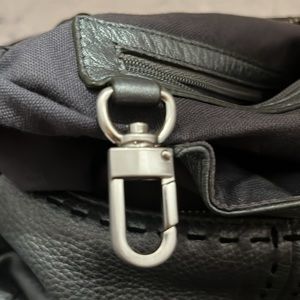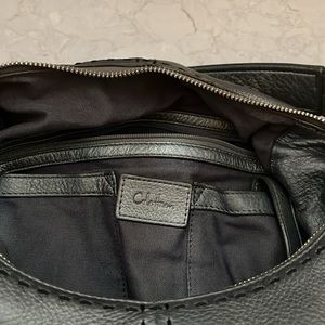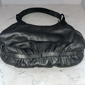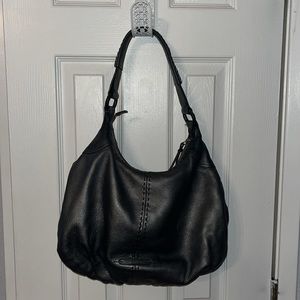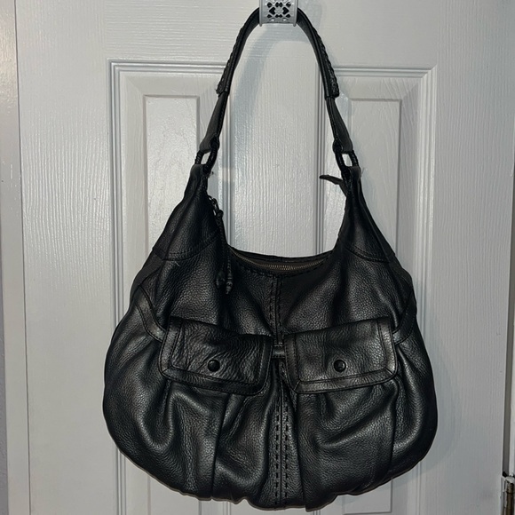 This beautiful and neutral Hobo bag has two outside pockets that are magnetic. Zipper on top. One large zippered inside pocket and two open pockets. This bag also has a D-ring inside to hold your keys. Good used condition. Dust bag included. Please see all pictures!