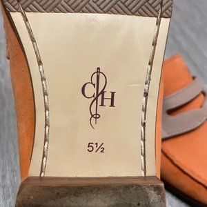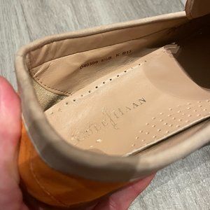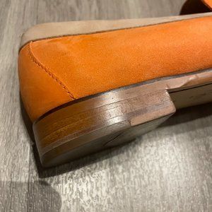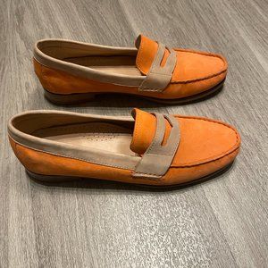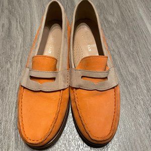 Cole Haan suede loafers. Tangerine and beige. Low heel. Size 5.5. Barely worn. Very good condition. Make a statement!