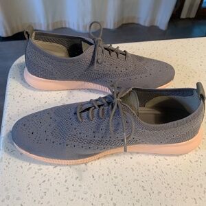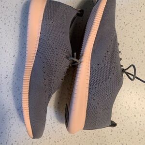 Lightweight and comfortable. Sole is light pink for interest. Top is a grey mesh.